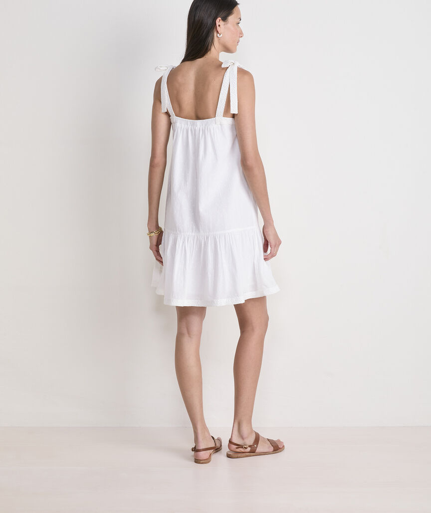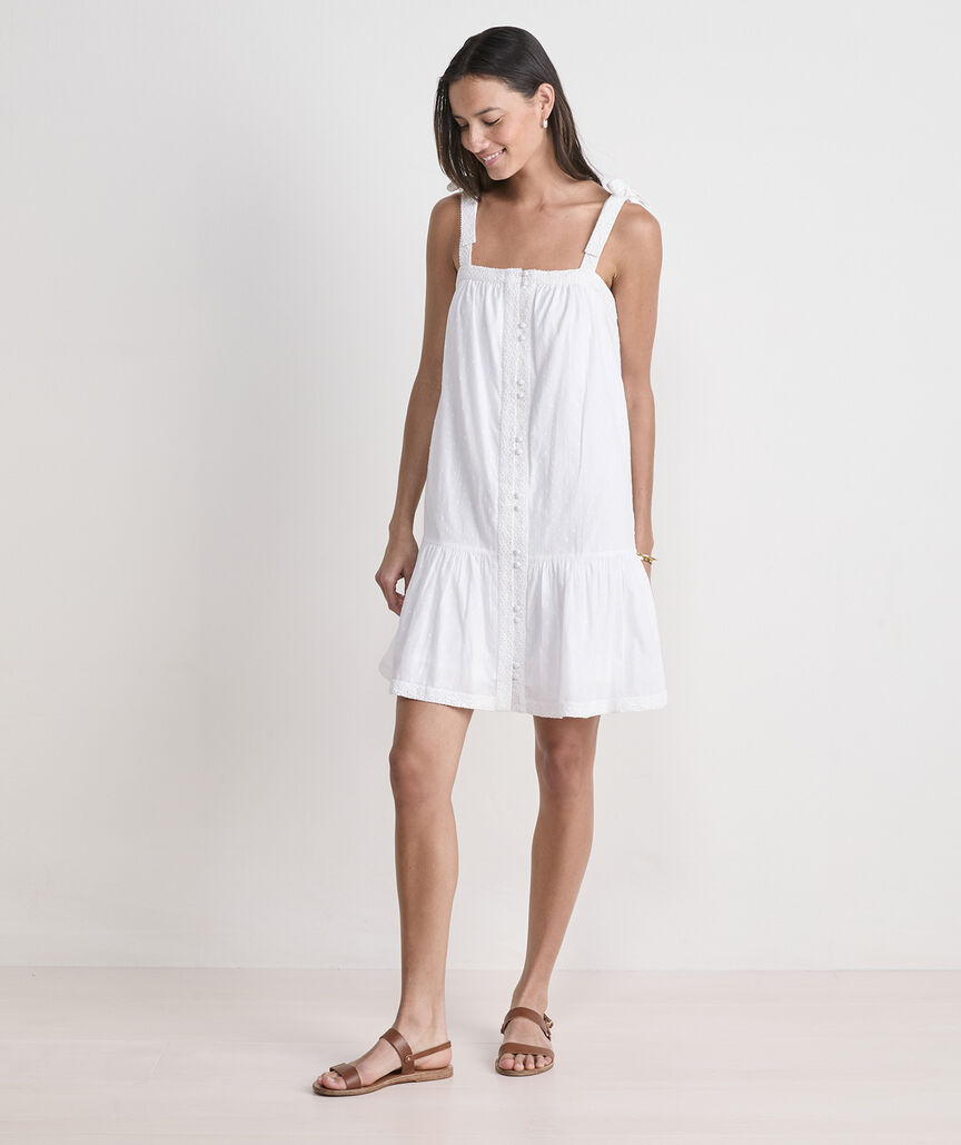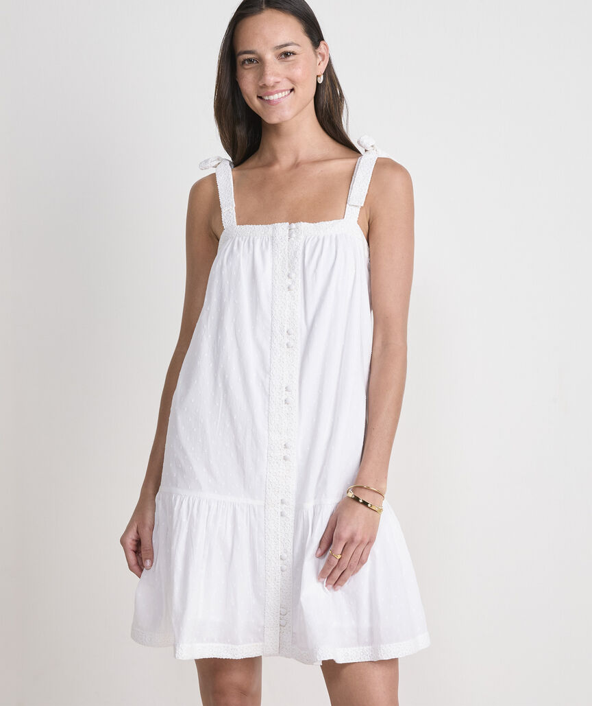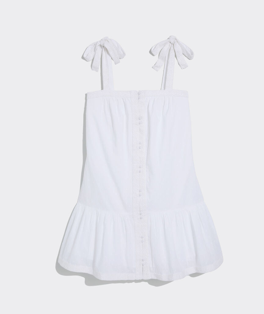 Expect compliments every time you wear this chic mini dress, complete with charming clip dot fabric, adjustable shoulder ties and feminine lace details.