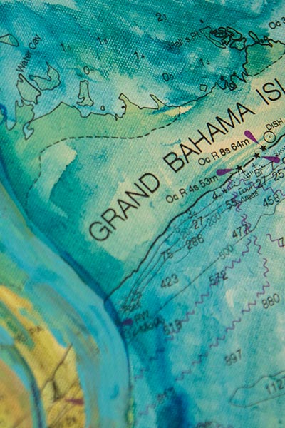 Carly has always been drawn to the ocean. When she started working the nautical charts into her art, it all clicked. “The art just seemed to make sense,” she said. “This is how I connect with marine life—on the charts there are all the natural landforms, and it shows how we separate everything with lines and bars and numbers. I try to make a connection between the rigidity of the numbers and the natural elements of the painting. It allows us to think about how we cohabitate with nature.”